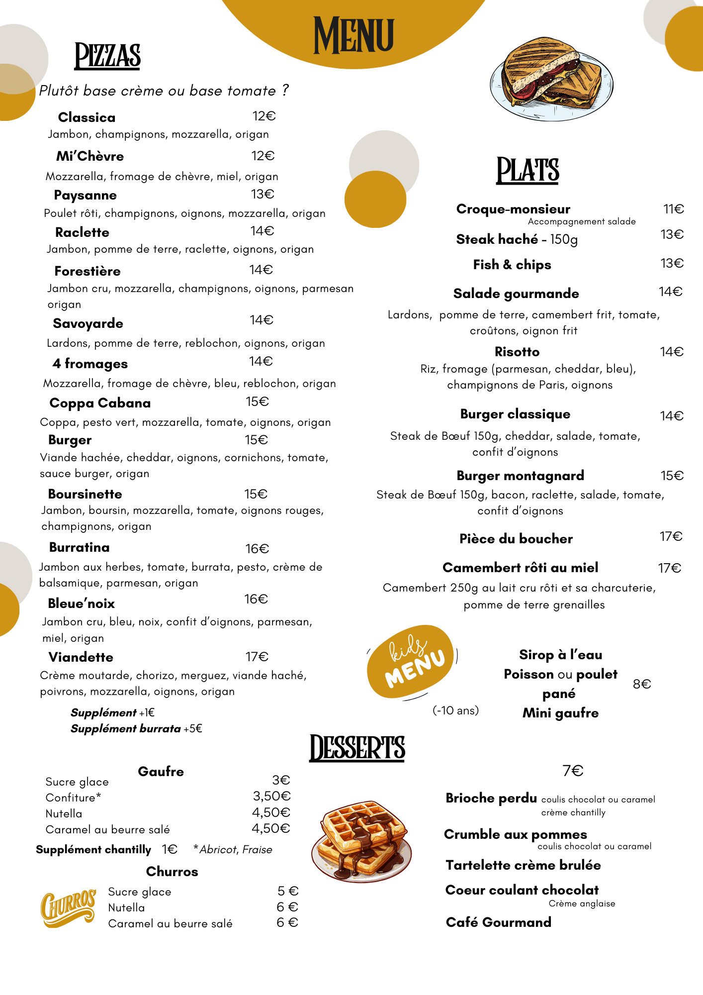 Midi : 12h – 13h service de plats chauds (burgers, camembert rôti, salades, etc.) — pas de pizzas